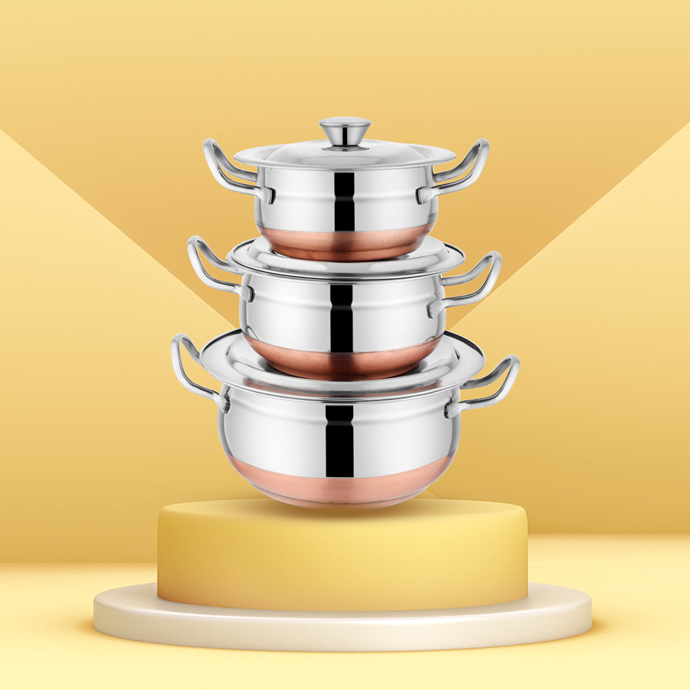 - Steel Handi Set Copper Bottom Handi Set of 3pc Kitchen Serving, Cooking Bowl biryani milk pot pan Handi Pieces Kitchen Appliances Punjabi handi biryani steel tope set without lid SIZES-1,2,3