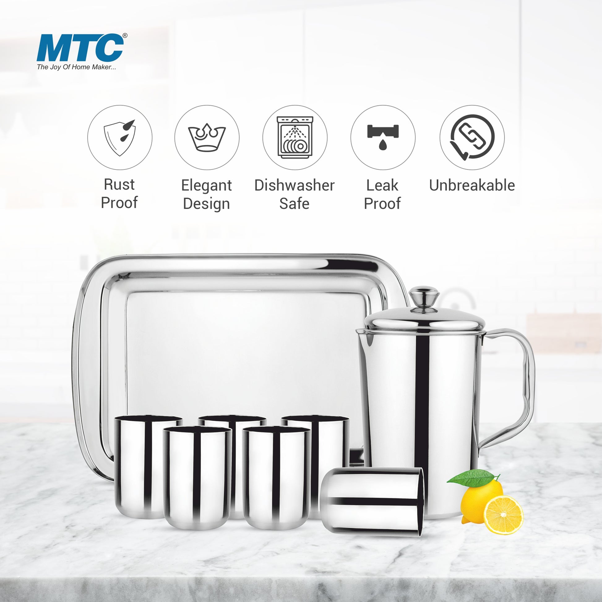 MTC DIAMOND LEMON SET ULTIMATE (8 PCS) Jug Glass Tray Set (Stainless Steel)